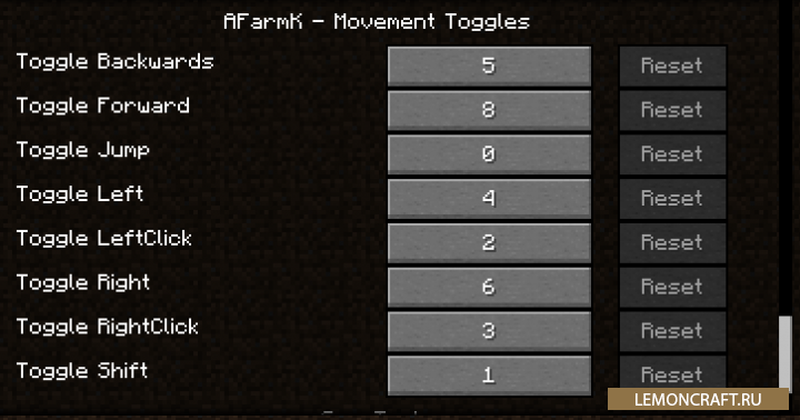 Мод на автокликер AFarmK избавит вас от некоторых рутинных действий, связанных с постоянным нажатием одной и той же кнопки. Данный мод может имитировать нажатие таких клавиш, как ЛКМ и ПКМ, зажатие Shift, ходьба. Мод отлично подойдет для тех, кте хочет выйти и попить чая, но при этом не останавливать процесс игры.